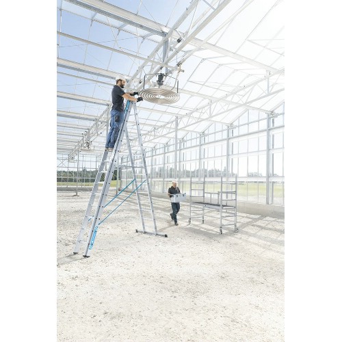 Kombistege med hög funktionalitet och flexibilitet. Stel förbindning. Stegsidessäkring genom stabila perlonremmar med isydd fästskena. Optimalt fäste för styrbeslag genom konstruktion som omfattar hela stegsidan. Hissäkring och styrbeslag är utbytbara tack vare skruvförbindning. Utbytbara glidskydd av plast för halksäker stabilitet. Stegpinnar och stegsidor av strängpressad aluminiumprofil. Uppfyller standarden SS-EN 131 professionell.
