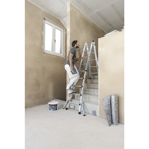 Multifunktionell, utdragbar teleskopkombistege perfekt för användning i trappor genom höjdinställning på båda sidor från stegpinne till stegpinne. Robust och hållbart utförande. Kompakt och utrymmesbesparande för enkel transport. Med utfällbara stödben för användning som anliggande stege enligt EN131-1. Stödbenen kan fällas ihop för att spara plats vid transport eller vid användning som trappstege. Stegsida av strängpressad aluminium för högsta stabilitet. Funktionella, robusta bultgångjärn, skruvade och lätta att byta ut. Stegpinnen och stegsidan är förbundna med stabil kvalitetsfläns.