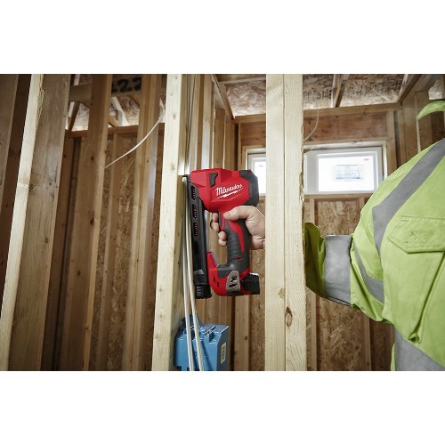 Effektiv och snabb kabelklammerpistol 12 V Li-Ion. Kompakt design som underlättar arbete i trånga och svåråtkomliga utrymmen. Anpassad för 25 mm långa kabelklammer, med ryggbredd 19 mm. Avfyrar upp till 1200 klamrar på en laddning med 2,0 Ah batteri. Stort magasin som rymmer 45 klamrar. Avfyrar inte på tomt magasin. Anpassningsbara anhåll för att passa många kabelstorlekar. Vändbar bälteskrok. Batteriindikator. LED-belysning. Flexibelt batterisystem, passar samtliga Milwaukee M12-batterier.